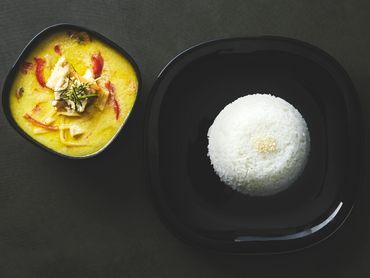 Cremet kokosmælk med rød karry, bambus, tomater, basilikum og ananas. Vælg mellem kylling, svinekød eller vegetar tofu. Serveres med ris.