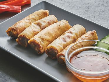 Traditionelle thailandske forårsruller med fyld af hakkede gulerødder, løg, forårsløg, hakket svinekød, æg og tilsat orientalske kryderier. Serveres med chilisauce.