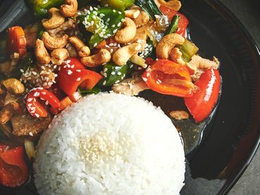 Lynstegt ret med cashewnødder, peberfrugt, løg, forårsløg, gulerødder, champignon og hvidløg. Vælg mellem kylling, laks, svinekød, vegetar tofu eller vegansk tofu. Serveres med ris.