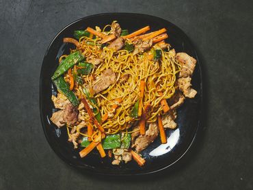 Stegte æggenudler m. sukkerærter, gulerødder, forårsløg, champignon og et speciel miks a krydderier. Vælg mellem svinekød, kylling og vegetar tofu.