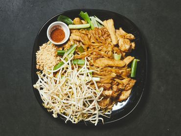 Nuddelret med bønnespirer, lime, æg, forårsløg, tofu og nødder. Vælg mellem svinekød, kylling, tigerrejer (+14) eller vegetar tofu. (Ved valg af vegetar tofu vil der blive tilsat ekstra tofu)