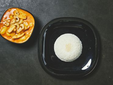 Cremet kokosmælk med massaman karry, løg, kartofler, peanuts of cashewnødder. Vælg mellem kylling, svinekød eller vegetar tofu. Serveres med ris